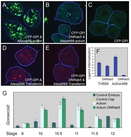 Fig. 7. Inhibition of endocytosis by Rab5S43N does not prevent gene induction in response to activin. (A) Animal pole blastomeres derived at the late blastula stage from an embryo previously injected with RNA encoding lactate dehydrogenase (Ldh; control RNA) and then cultured in the presence of Alexa488-activin. Note the internalised fluorescent activin.(B) Animal pole blastomeres derived at the late blastula stage from embryos previously injected with RNA encoding Rab5S43N (DNRab5) and then cultured in the presence of Alexa488-activin as in A. Note the strong inhibition of internalisation of labelled activin. (C) Control animal pole blastomeres derived as in A but not exposed to Alexa488-activin. Note the yolk autofluorescence. (D) Animal pole blastomeres were derived from embryos injected with RNAs encoding Ldh and the transferrin receptor and were then cultured in the presence of Alexa594-transferrin. Note the internalised transferrin. (E) Animal pole blastomeres were derived from embryos injected with RNAs encoding Rab5S43N and the transferrin receptor and were then cultured in the presence of Alexa594-transferrin. Note the slight inhibition of internalisation of fluorescent transferrin. All embryos in A-E were also injected with RNA encoding the CFP-GPI membrane marker(blue). (F) Quantitation of experiments illustrated in A-E. (G)Expression of Gsc in whole embryos and in animal pole regions treated as indicated and analysed by real-time quantitative PCR at the indicated stages (n=2). Other target genes are shown in Fig. S4A,B in the supplementary material (n=2). Bars represent standard errors of technical replicates. Three additional experiments of this sort were performed in which gene expression analysis was carried out at a single time point;these gave similar results. |