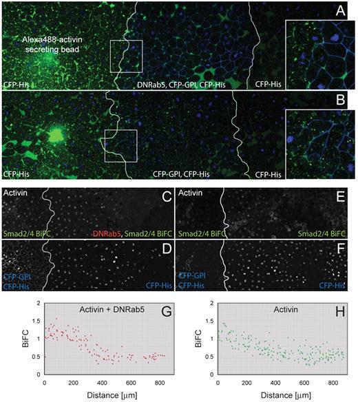 Fig. 8. Effect of Rab5S43N on activin passage and long-range signalling. (A) Three juxtaposed animal pole regions with white lines representing borders between explants. A bead previously soaked in Alexa488-activin was implanted in the left-hand animal cap and the middle section expressed both CFP-GPI and Rab5S43N. All three explants expressed CFP-histoneH2B. Note the extracellular Alexa488-activin in the middle section at a distance from the bead (n=7). (B) Control for A in which the middle section does not express Rab5S43N. Images on right represent enlargements of outlined areas. (C-F) Three juxtaposed animal pole regions in which all tissues expressed Smad2/4-BiFC reagents and CFP-histoneH2B, and the left-hand animal cap expressed activin and CFP-GPI (n=9). In C and D the centre and right-hand animal pole regions expressed Rab5S43N. (C,E) Fluorescence derived from Smad2/4-BiFC. Note the long-range signalling and activation of Smad2/4-BiFC even in the presence of Rab5S43N. (D,F) CFP-histoneH2B fluorescence to reveal nuclei. (G,H) Quantitation of Smad2/4-BiFC fluorescence normalised to CFP-histoneH2B (as described in Fig. 3) in the samples illustrated in C,D (G) and E,F (H) (n=3). |