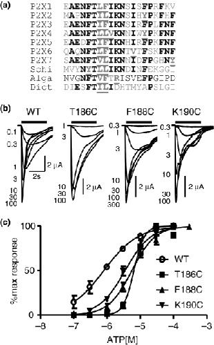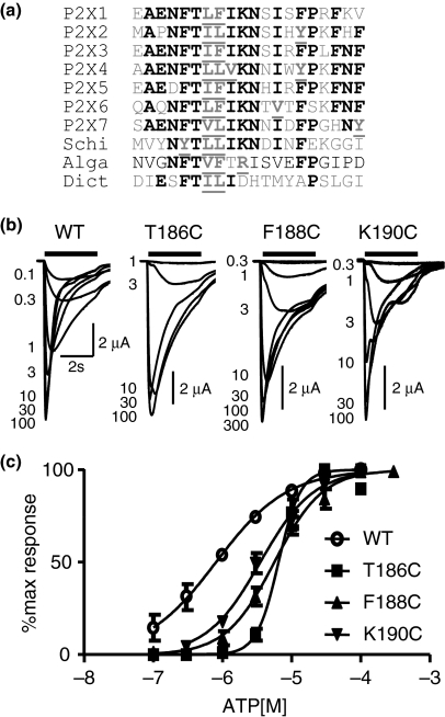 Fig. 1. Effects of cysteine point mutants of E181 to V200C on ATP potency at human P2X1 receptors. (a) Sequence line-up for the region corresponding to E181 to V200 of the P2X1 receptor for the seven human, Schistosoma mansoni (Schi) (Agboh et al. 2004), the green alga Ostreococcus tauri (Alga) (Fountain et al. 2008) and amoeba Dictyostelium discoidium (Dict) (Fountain et al. 2007) P2X receptors. Residues conserved in at least five of the human isoforms are shown in black bold, conservative substitutions are shown underlined in bold gray. (b) Concentration responses to ATP for oocytes expressing WT, T186C, F188C and K190C mutant P2X1 receptors. Application of ATP is indicated by bar. (c) Summary of concentration response data for WT and mutants T186C, F188C and K190C that showed significant decreases in ATP potency (n = 3–4).