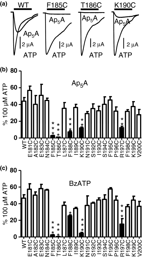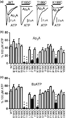 Fig. 2. Efficacy of the partial agonists Ap5A and BzATP. (a) Currents evoked by ATP and Ap5A application (both 100 μM) at WT, F185C, T186C and K190C mutant P2X1 receptors. Agonist application for 3 s is indicated by bar. (b) Summary of the efficacy of the partial agonist Ap5A (100 μM) expressed as a percentage of the response to a maximal concentration of ATP (100 μM). (c) Summary of the efficacy of the partial agonist BzATP (100 μM) expressed as a percentage of the response to a maximal concentration of ATP (100 μM). Significant reductions in efficacy are shown as black bars, *p < 0.05, **p < 0.01, ***p < 0.001, (n = 3–5).