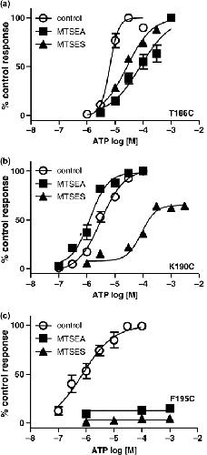 At the majority of mutants in the region Glu181-Val200 incorporating a conserved AsnPheThrPhiPhixLys motif cysteine substitution had no effect on sensitivity to ATP, partial agonists, or methanethiosulfonate (MTS) compounds. For the F185C mutant the efficacy of partial agonists was reduced by approximately 90% but there was no effect on ATP potency or the actions of MTS reagents. At T186C, F188C and K190C mutants ATP potency and partial agonists responses were reduced. The ATP sensitivity of the K190C mutant was rescued towards WT levels by positively charged (2-aminoethyl)methanethiosulfonate hydrobromide and reduced by negatively charged sodium (2-sulfonatoethyl) methanethiosulfonate. Both MTS reagents decreased ATP potency at the T186C mutant, and abolished responses at the F195C mutant. (32)P-2-azido ATP binding to the mutants T186C and K190C was sensitive to MTS reagents consistent with an effect on binding, however binding at F195C was unaffected indicating an effect on gating. The accessibility of the introduced cysteines was probed with (2-aminoethyl)methanethiosulfonate hydrobromide-biotin, this showed that the region Thr186-Ser192 is likely to form a beta sheet and that accessibility is blocked by ATP. Taken together these results suggest that Thr186, Phe188 and Lys190 are involved in ATP binding to the receptor and Phe185 and Phe195 contribute to agonist evoked conformational changes.
