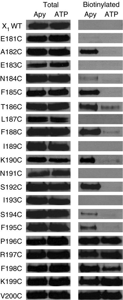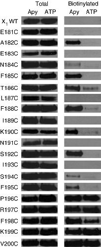 Fig. 6. MTSEA-biotinylation reveals the surface accessibility of the region E181-V200. Representative western blots show the equivalent total levels of WT and P2X1 receptor mutants expressed in the oocytes used for the biotinylation assay (left hand panel). To determine the surface accessibility of introduced cysteine residues oocytes were incubated with MTSEA-biotin, and biotinylated proteins isolated, run on a gel and blotted with an anti-P2X1 receptor antibody. Oocytes were either pre-treated with apyrase (to break down any endogenous nucleotides) or ATP (to activate the receptor). For WT receptors no biotinylation could be detected. Biotinylation was also below the limit of detection for E181C, E183C, L187C, I189C, N191C and I193C. At N184C and S194C weak biotinylation that was ATP sensitive was recorded. ATP sensitive biotinylation was detected at A182C, F185C, T186C, F188C, K190C, S192C and F195C. MTSEA-biotin was observed for P196C-V200C mutants either in the absence of presence of ATP. Blots are representative of those from three to eight separate batches of oocytes.