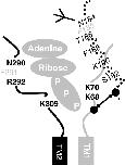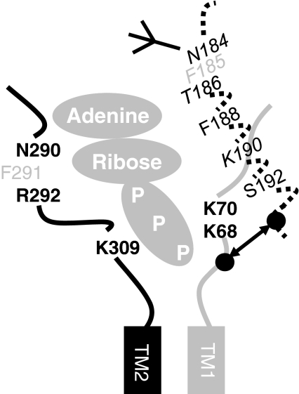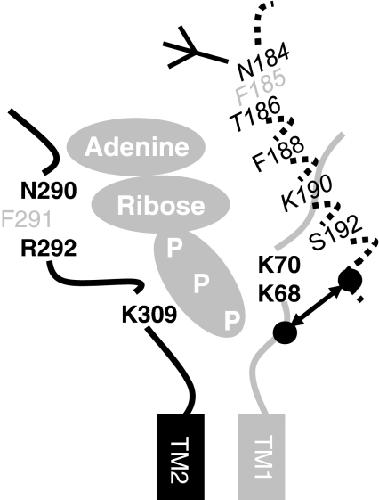 Fig. 7. Model of the ATP binding site. Portions of the extracellular loop adjacent to either the first (in gray) or second (in black) transmembrane segment are shown for two adjacent P2X1 receptor subunits. Conserved residues that have been shown to contribute to ATP potency are shown (gray residues correspond to conserved aromatic residues in areas of high conservation). The dotted line corresponds to the region Glu181-Val200 that was characterized in the present study, the zig-zag line corresponds to the region of beta sheet as indicated by the pattern of MTSEA-biotinylation. Based on studies on the zinc and copper binding site of P2X7 receptors (Liu et al. 2007) it is possible that residues His62 and Asp197 (P2X7 receptor numbering, indicated by black balls) are close together (shown by arrow) as suggested for residues involved in the zinc binding site at P2X2 receptors (Nagaya et al. 2005). This would bring the residues Phe195, Lys190 and Thr186 close to the putative ATP binding site. If this is the case Lys190 could be close to the other conserved lysine residues and this could account for the charge dependent effects of MTS reagents on the K190C mutant. Asn184 is glycosylated (Roberts and Evans 2006).