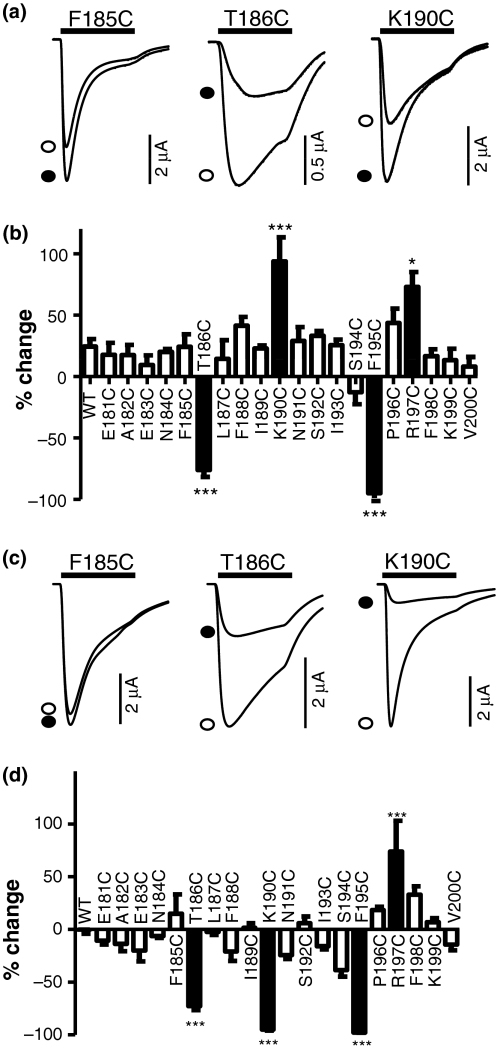 Fig. 3. Effects of charged MTS reagents on ATP evoked P2X1 receptor currents. (a) Responses to an ∼ EC50 concentration of ATP are shown before (open symbol) and after the application of 1 mM MTSEA (filled symbol) for the mutants F185C, T186C and K190C. ATP application (3 s) is indicated by bar. (b) Summary of the effects of MTSEA on WT and mutant P2X1 receptors. (c) Responses to an ∼ EC50 concentration of ATP are shown before (open symbol) and after the application of 1 mM MTSES (filled symbol) for the mutants F185C, T186C and K190C. ATP application (3 s) is indicated by bar. (d) Summary of the effects of MTSES on WT and mutant P2X1 receptors. Data are expressed as % change (0% indicates no change), on MTS application, significant differences from WT are shown by black bars, *p < 0.05, ***p < 0.001, (n = 3–14).