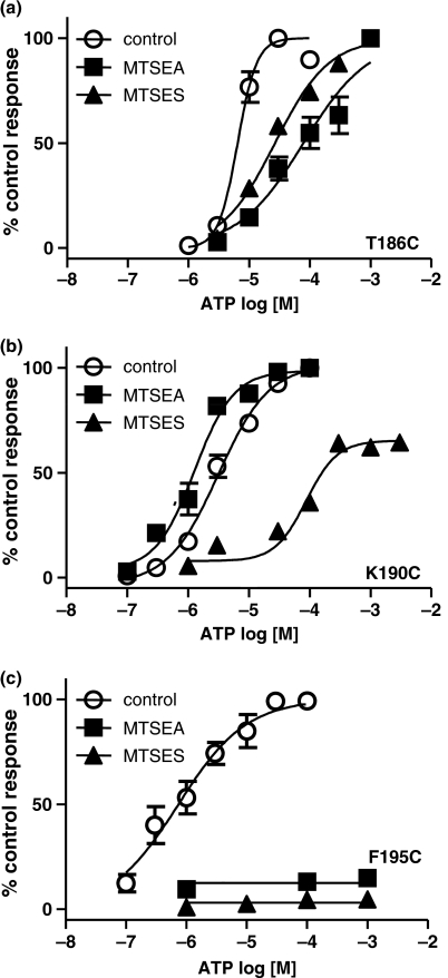 Fig. 4. Effects of MTS reagents on ATP concentration responses at P2X1 receptor mutants. Concentration response curves to ATP were determined under control conditions or following incubation with MTSEA (1 mM for 1 h followed by washout) or MTSES (1 mM for 3 h followed by washout). (a) At T186C the EC50 was significantly increased by both MTSEA and MTSES with no effect on the peak response. (b) At K190C MTSEA significantly increased whilst MTSES significantly decreased ATP potency. For MTSES peak current responses were also reduced. (c) MTSEA and MTSES treatment reduced responses at the F195C mutant receptor by > 90% even for a maximal concentration of ATP (1 mM).