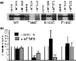 Fig. 5. Effects of MTS reagents on 32P-2-azido ATP cross-linking to WT and mutant P2X1 receptors. (a) Oocytes expressing WT and mutant P2X1 receptors were UV irradiated in the presence of 32P-2-azido ATP and P2X1 receptors were isolated by immunoprecipitation and run on a gel and exposed to X-ray film. The autoradiographs show the level of radioactivity associated with the P2X1 receptors under control conditions and the effects of MTSEA or MTSES (both 1 mM). (b) Summary data of the effects of MTSEA and MTSES on 2-azido ATP cross-linking to WT, T186C, K190C and F195C mutant P2X1 receptors. Data are expressed as % of control condition for each group of oocytes and corrected for background levels. (n = 4 batches of oocytes for each). **p < 0.05, ***p < 0.001.