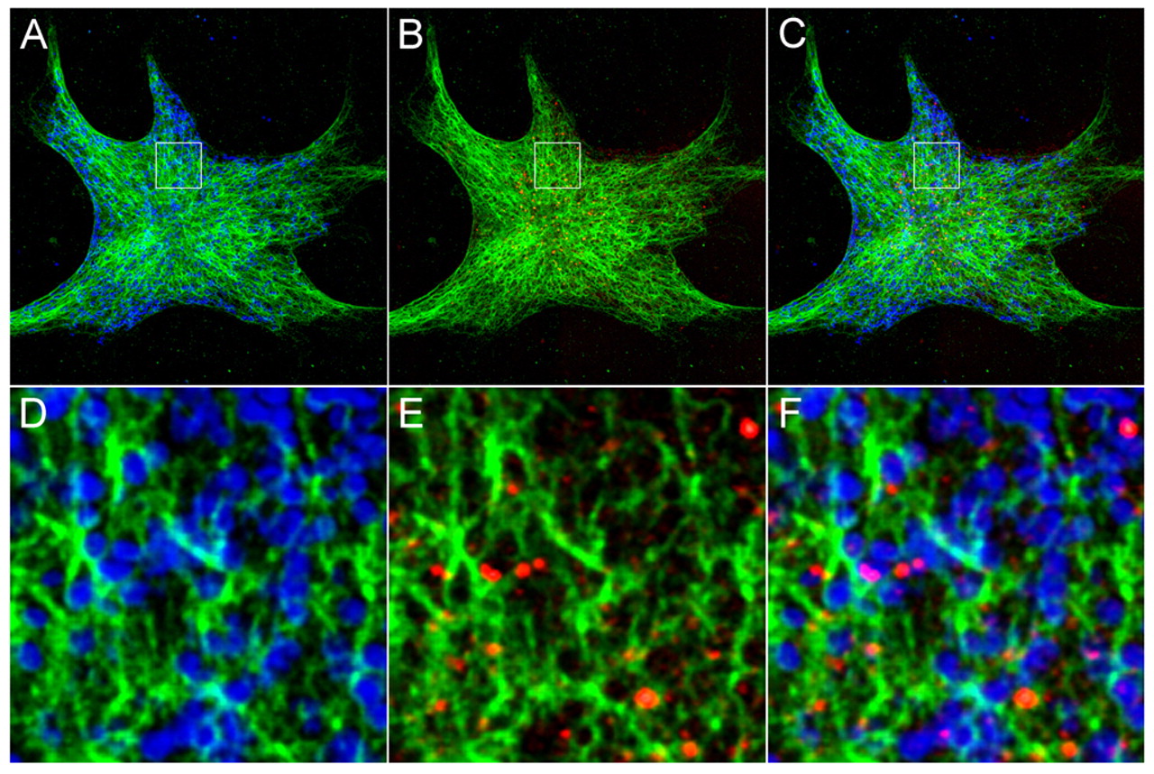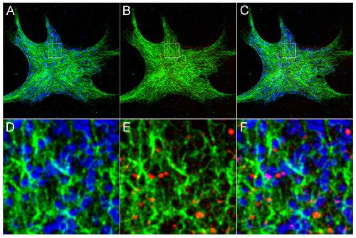 Fig.2. Lysosomes are not closely associated with vimentin IFs. Melanophores were incubated with LysoTracker Red for 1 hour to visualize lysosomes, followed by processing for immunofluorescence to detect vimentin. Melanosomes were imaged using bright-field illumination and the image was inverted and given a blue hue in Photoshop. A-C show a low magnification, double (A,B) and triple (C) overlay images of vimentin (green), melanosomes (blue) and fluorescently labeled lysosomes (red). (D-F) Higher magnification images of the boxed regions in A-C show very few lysosomes that are closely associated with vimentin IFs.
