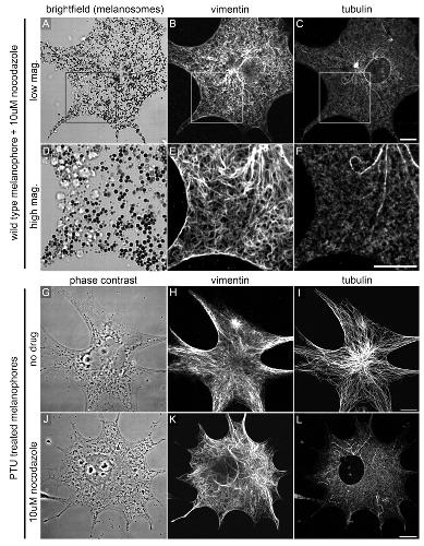 Fig.3. Vimentin IFs association with melanosomes is independent of microtubules. (A-C) The distribution of vimentin IFs is not affected by nocodazole-induced depolymerization of MTs. The IF network remains fully extended and densely distributed throughout the cytoplasm. See Fig. 1A-F for comparison. Scale bar: 5 μm. (D-F) Higher magnification images of the boxed regions in A-C show vimentin filaments surrounding melanosomes in the absence of MTs. Scale bar: 5 μm. (G-I) The vimentin IF network is similarly distributed as an extended network in PTU-treated melanophores that lack melanosomes. Scale bar: 5 μm. (J-L) Nocodazole treatment of these cells does not appear to cause reorganization of the vimentin IF network, demonstrating that vimentin IF distribution is not a result of melanosomes anchoring IFs. Scale bar: 5 μm.