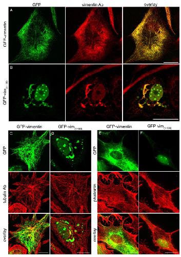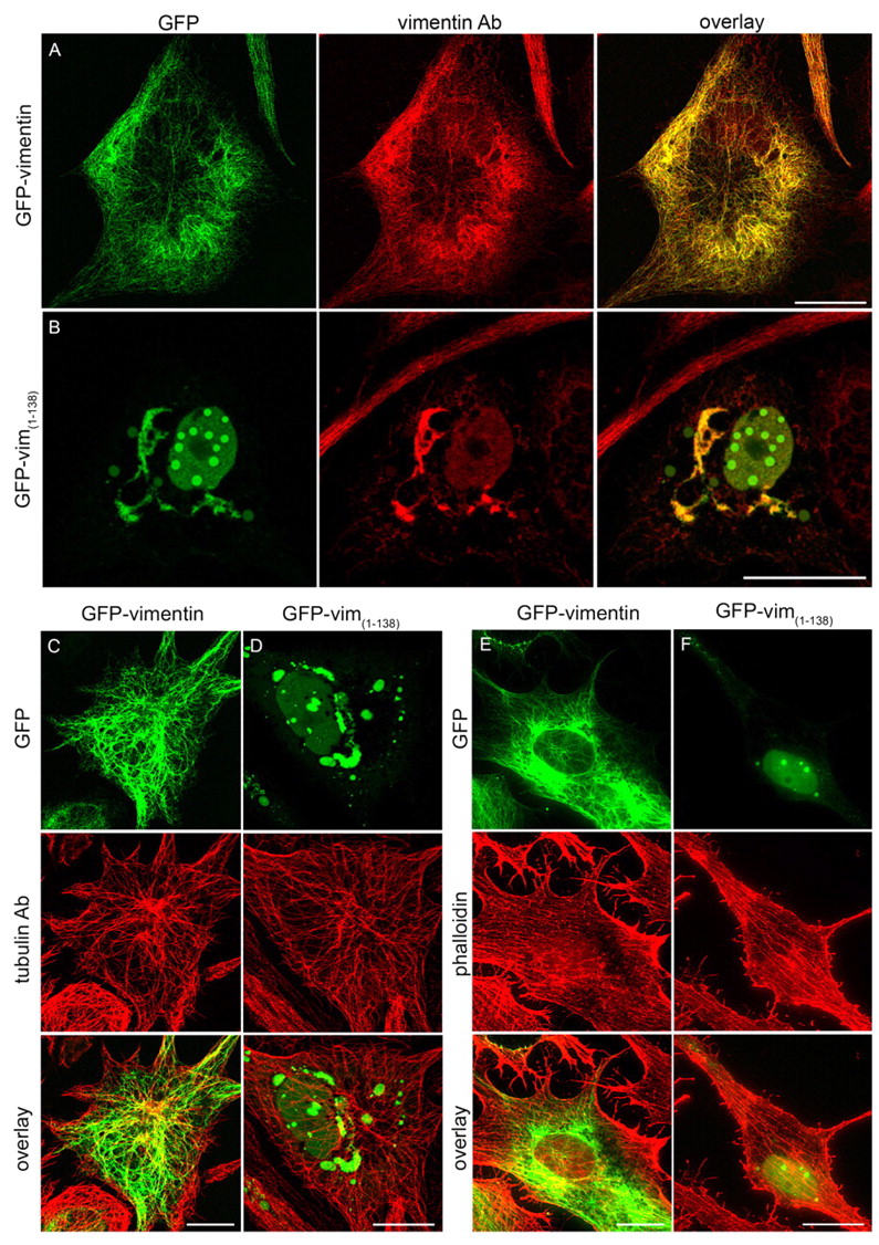 Fig.4. GFP-vimentin incorporates into the endogenous vimentin IF network and a GFP-tagged truncated vimentin construct disrupts the endogenous network in Xenopus melanophores. (A) Cells were transfected with a GFP-tagged full-length Xenopus vimentin construct for 48 hours. The GFP-vimentin (shown in green) co-assembles with endogenous vimentin (visualized by antibody staining; shown in red). (B) Cells transfected for 48 hours with a dominant-negative construct containing the head and alpha-helical domain 1A of vimentin [GFP-vim(1-138)] have a disrupted endogenous network. The truncated vimentin forms aggregates in the nucleus and perinuclear area, and sequesters the endogenous vimentin away from the peripheral cytoplasm. The truncated vimentin was tagged with a C-terminal GFP (shown in green), and the endogenous network was visualized by immunostaining (shown in red). (C,D) Disruption of vimentin IFs does not affect the distribution of microtubules. Cells were transfected with either full-length GFP-vimentin (C; green) or GFP-vim(1-138) (D; green) for 48 hours and immunostained with a microtubule-specific antibody (red). (E,F) Disruption of vimentin IFs does not affect the distribution of actin filaments. Cells were transfected with either full-length GFP-vimentin (E; green) or GFP-vim(1-138) (F; green) for 48 hours. Actin filaments were visualized by phalloidin (red). Scale bars: 20 μm.