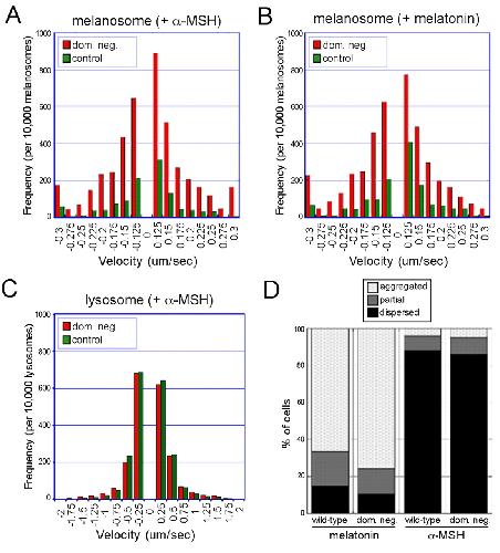 Fig.5. Melanosomes move more in the absence of a vimentin IF network. (A,B) The number of moving melanosomes and their speed were elevated in both retrograde (â) and anterograde (+) directions in cells expressing the dominant negative vimentin construct, GFP-vim(1-138) (dom. neg.), when compared with control cells. These increases were evident during both dispersion by α-MSH treatment and melatonin-induced aggregation. (C) In contrast to melanosomes, lysosomal movement was not affected by the expression of GFP-vim(1-138) (dom. neg.) as compared with control cells. Lysosomes were tracked in cells treated with α-MSH to mirror the melanosome dispersion situation. Similar results were obtained in unstimulated cells (not shown). (D) Disruption of the vimentin IF network by overexpression of the dominant negative vimentin (dom. neg.), did not affect the end states of melanosomes in response to melatonin and α-MSH at 60 minutes after hormone treatment. Melanosomes were predominantly aggregated in both transfected and wild-type cells in response to melatonin and dispersed in both cell types in response to α-MSH.