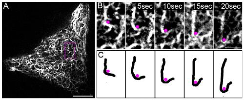 Fig.6. Vimentin filaments undergo dramatic shape changes during melanosome movement. Xenopus melanophores expressing GFP-vimentin were used for live-imaging experiments. These cells were serum starved for 2 hours, followed by treatment with α-MSH to stimulate granule dispersion and then imaged using a spinning disk confocal microscope with 5-second frame intervals. (A) A low magnification image at time point 0 (scale bar: 5 μm). (B) Higher magnification, time-lapse frames show a granule, pseudo-colored purple, moving with the vimentin filament that bends and moves toward the lower left field of view (scale bar: 1 μm; also see supplementary material Movie 1). (C) A cartoon depiction of the relevant filament and granule from B, for easier visualization.