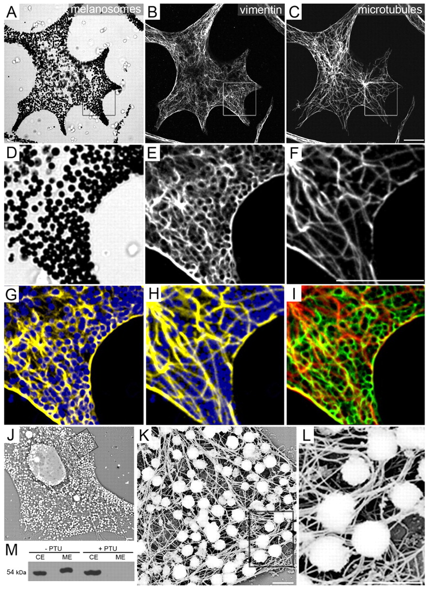 Fig.1. Microscopic and biochemical evidence for vimentin association with melanosomes in Xenopus melanophores. (A-C) Immunofluorescence preparation of melanophores reveals a dense network of vimentin filaments (B) that permeate the cytoplasm. Microtubules form a sparse, radial network (C). Scale bar: 5 μm. (D-F) Higher magnification images of boxed regions in A-C show melanosomes (D) surrounded by a dense network of vimentin filaments (E). Scale bar: 5 μm. (G-I) Pseudo-colored overlays of D-F. Vimentin fibers (yellow) wrap around individual and clusters of melanosomes (blue; G). This encaging is not observed between microtubules (yellow) and melanosomes (blue; H). An overlay of vimentin (green) and microtubules (red) is shown in I. (J-L) Melanophores were processed for platinum replica electron microscopy using a technique that preserves intermediate filaments and dissolves microtubules (MTs) and actin filaments (MFs) (Svitkina et al., 1995) (see Materials and Methods). Melanosomes appear to remain closely associated with vimentin filaments in the absence of MTs and MFs. K and L are higher magnification views of J. Scale bars: (J) 2 μm; (K,L) 1 μm. (M) Western blot analysis of purified melanosomes using an antibody specific for vertebrate vimentin shows co-purification of vimentin with the granules in wild-type cells (âPTU; CE, total cell extract; ME, melanosome extract). Vimentin co-purifies with granules isolated from melanophores treated with either melatonin or α-melanocyte stimulating hormone (α-MSH; unpublished data). In PTU-treated cells that lack melanosomes, vimentin is not present in the pellet (+PTU).