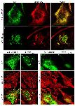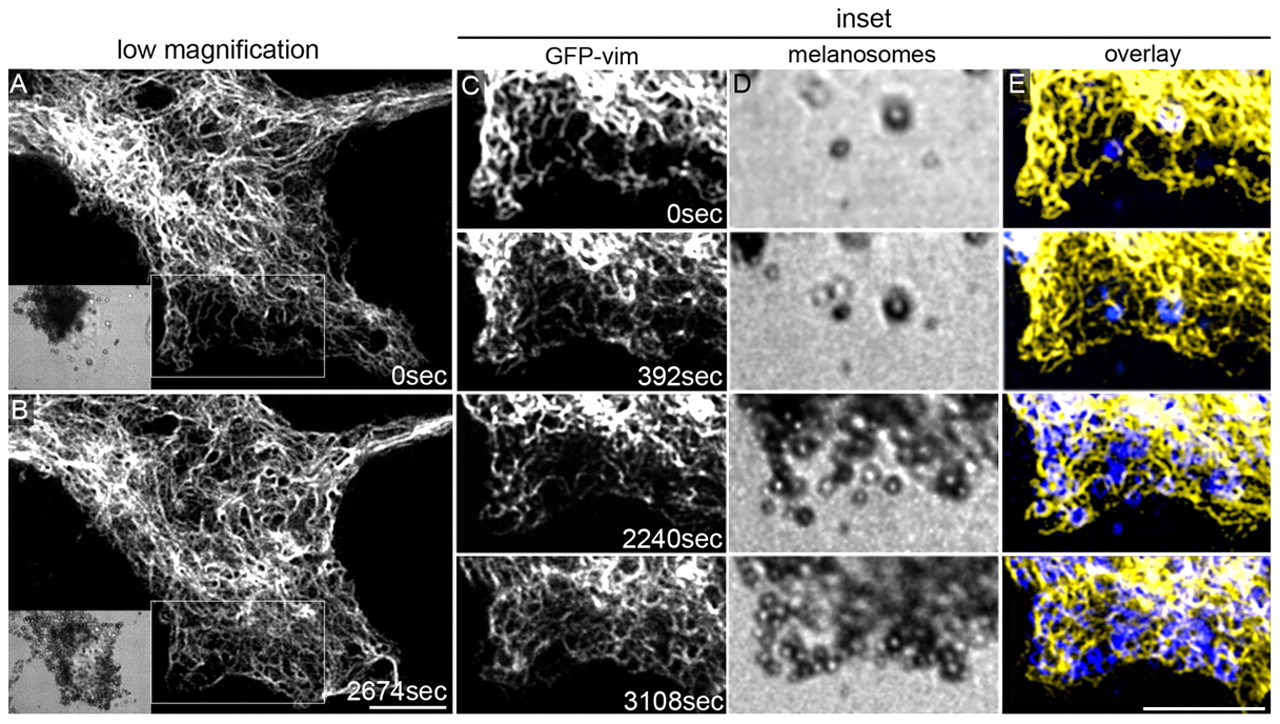 Fig.8. Vimentin IF network remodeling in response to α-MSH. Time-lapse frames (from Movie 3 in supplementary material) show GFP-vimentin networks re-distributing towards the periphery of the cell (A and B; granules are shown in lower left insets). Higher magnification images show vimentin filaments forming a cage-like network in the peripheral cytoplasm as granules move in to the region (C-E; vimentin is shown in yellow and granules in blue in E; compare vimentin distributions between first and last time frames). Scale bars: 5 μm. Vimentin IF network dynamics during aggregation of granules can also be seen in Movie 2 in supplementary material.
