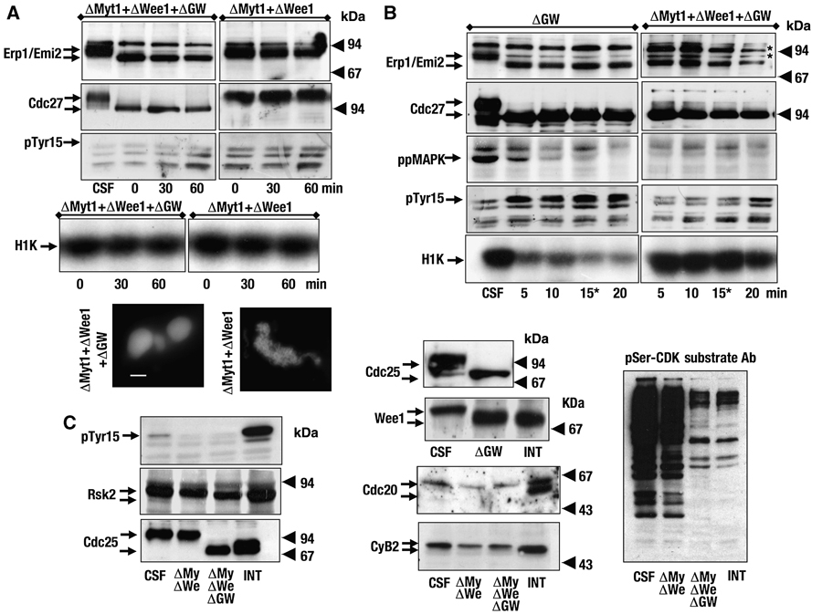 GW depletion induces mitotic exit in CSF extracts in the presence of high cyclin B–Cdc2 activity. (A) A triple depletion with Myt1–Wee1–GW antibodies or Myt1–Wee1–Control antibodies were carried out in CSF extracts and the phosphorylation of the indicated proteins, as well as the cyclin B–Cdc2 activity and chromatin condensation were analysed. (B) CSF extracts were immunoprecipitated twice with control antibodies or with anti-Myt1 and anti-Wee1 antibodies. Subsequently, anti-GW antibody-bound Dynabeads were added to the supernatants and samples were removed at the indicated times. * Time-point 0 min in GW immunodepletions of Figure 1 corresponds to time-point 15 min of this figure. (C) Supernatants of GW, Myt1–Wee1 or Myt1–Wee1–GW immunoprecipitates were used to analyse the phosphorylation of the indicated proteins using western blot. Bar 5 μm.