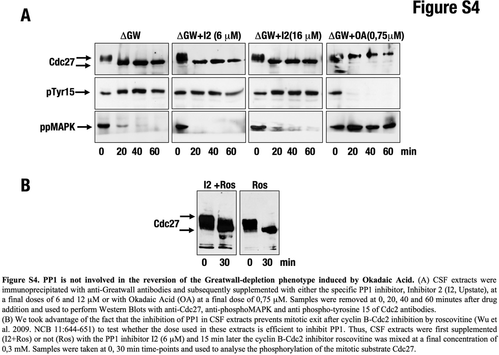 ???displayArticle.abstract??? Greatwall (GW) is a new kinase that has an important function in the activation and the maintenance of cyclin B-Cdc2 activity. Although the mechanism by which it induces this effect is unknown, it has been suggested that GW could maintain cyclin B-Cdc2 activity by regulating its activation loop. Using Xenopus egg extracts, we show that GW depletion promotes mitotic exit, even in the presence of a high cyclin B-Cdc2 activity by inducing dephosphorylation of mitotic substrates. These results indicate that GW does not maintain the mitotic state by regulating the cyclin B-Cdc2 activation loop but by regulating a phosphatase. This phosphatase is PP2A; we show that (1) PP2A binds GW, (2) the inhibition or the specific depletion of this phosphatase from mitotic extracts rescues the phenotype induced by GW inactivation and (3) the PP2A-dependent dephosphorylation of cyclin B-Cdc2 substrates is increased in GW-depleted Xenopus egg extracts. These results suggest that mitotic entry and maintenance is not only mediated by the activation of cyclin B-Cdc2 but also by the regulation of PP2A by GW.