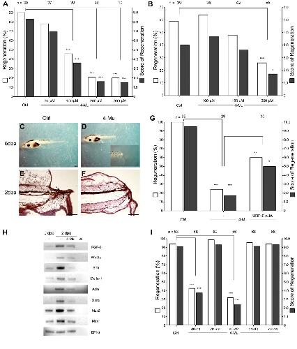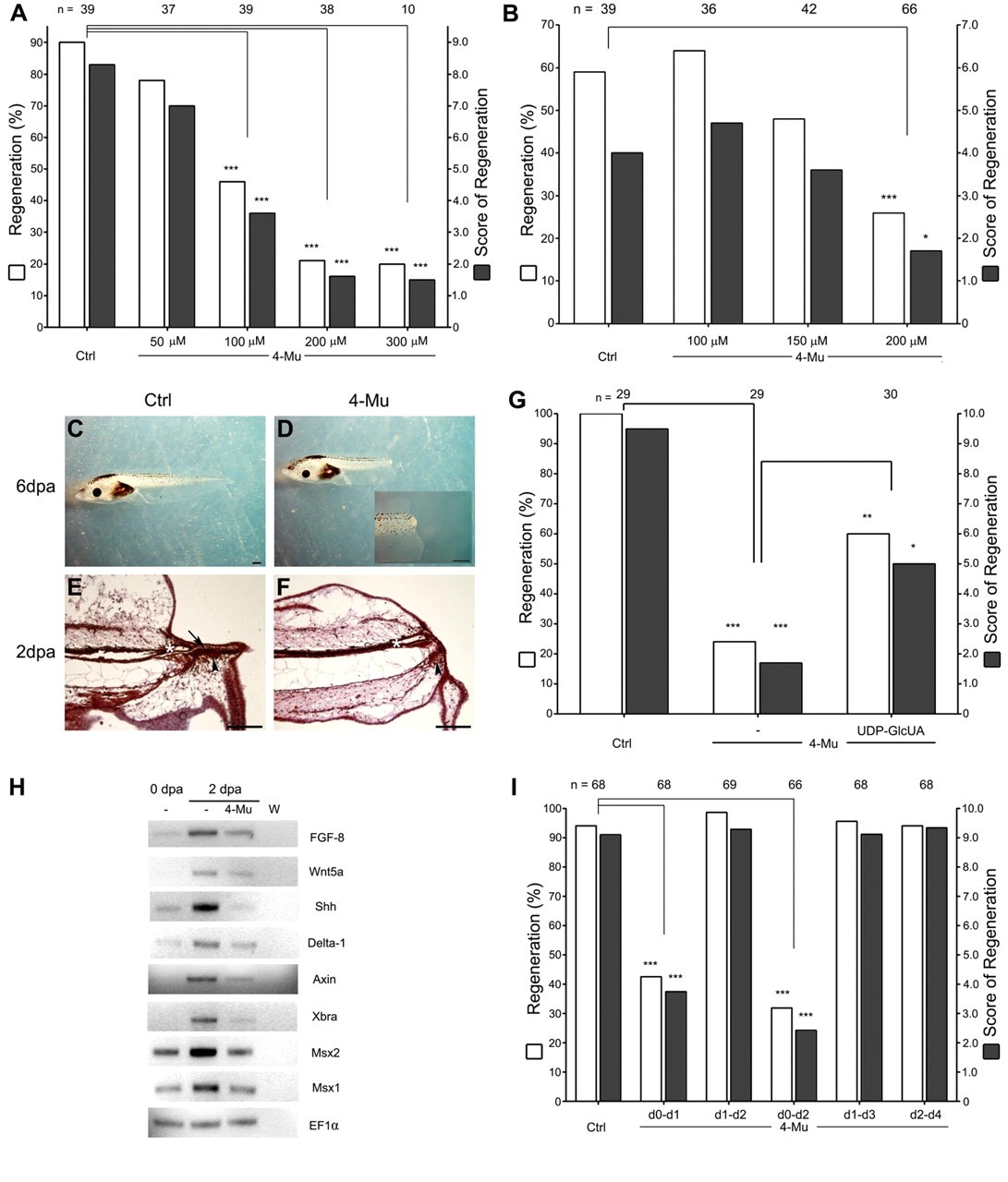 Fig. 3. 4-Methylumbelliferone blocks tail regeneration in a specific and time-dependent manner. (A,B) Tadpoles at stage 41/42 (A) or 49/50 (B) were amputated and incubated during the first 24 or 48 hpa with 4-Mu, respectively. After removal of the chemical tails were allowed to regenerate and regeneration assessed by tail external appearance under the stereoscope. Regeneration percentage (white bars) and score of regeneration (black bars) are depicted. (C-F) Morphological appearance of regenerating tadpoles incubated with 4-Mu. (C) Control and (D) 4-Mu treated tadpoles were allowed to regenerate for 6 days and their external appearance was evaluated. (E) Control and (F) 4-Mu treated regenerating tails were fixed at 2 dpa and stained with Hematoxylin/Safranin. The terminal ampulla (asterisk), immature notochord (arrow) and mesenchymal cells (arrowhead) are indicated. (G) 4-Mu effect is specific. Amputated tails were incubated during the first day with 200 μM 4-Mu and equimolar amounts of UDP-GlcUA. (H) Semi-quantitative RT-PCR analysis of the expression levels of signaling pathway components at 2 dpa. Amputated tadpoles were incubated during the first 24 hours with or without 200 μM 4-Mu. (I) Time-dependent effect of 4-Mu. Tails from stage 41/42 tadpoles were amputated, incubated during different time windows with 150 μM 4-Mu and allowed to regenerate up to 6 dpa. The numbers on top of each bar correspond to the number of tadpoles analyzed for each experimental point. Scale bars: 500 μm in C,D; 200 μm in E,F. *P<0.05; **P<0.01; ***P<0.001. |