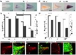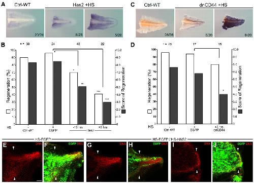 Fig. 4. HAS2 and dnCD44 F0 transgenic tadpoles have reduced levels of tail regeneration. (A-D) HAS2 (A,B) and dnCD44 F0 (C,D) transgenic tadpoles were prepared. (A,C) Levels of transgene expression were evaluated by in situ hybridization in EGFP-positive tails from tadpoles amputated and fixed 16 hours after heat shock. (B,D) Efficiency of regeneration was evaluated and compared to EGFP F0 transgenics that were also heat shocked. White bars, percentage of regeneration; black bars, score of regeneration). The numbers on top of each bar correspond to the number of tadpoles analyzed for each experimental point. All EGFP-positive tadpoles were considered for these experiments. The results shown are representative of three independent experiments. *P<0.05; **P<0.01; ***P<0.001. (E-J) HS-EGFP (E,F) or HS-EGFP/HS-HAS2 (G-J) F0 transgenic tadpoles were prepared and heat shocked 16 hours before amputation; EGFP-positive tadpoles were selected, heat shocked again at 8 hpa and fixed at 2 dpa. Nuclear DNA was stained with TOTO3 (red) and analyzed by confocal microscopy. Panels E,G and I show the red channel (nuclei) and panels F, H, J merge image (green: EGFP). Scale bar: 50μ m. |