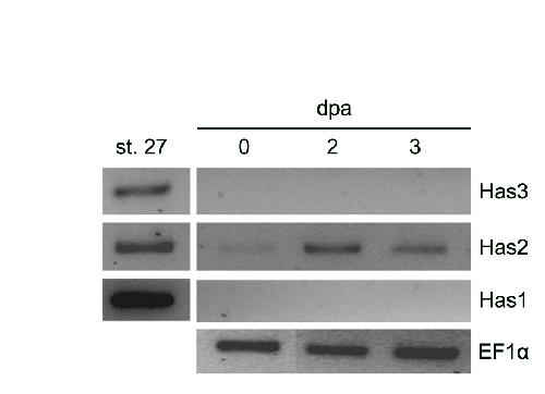 Fig. S1. Expression of HAS during tail regeneration. Tails from stage 48/50 X. laevis tadpoles were amputated and allowed to regenerate; RNA was isolated from the distal tip of the regenerating tail at different dpa. The levels of mRNA for HAS1, 2 and 3 were evaluated by semi-quantitative RT-PCR. RNA from stage 27 embryos was used as a positive control and EF1α as loading control. |
