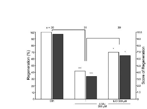 Fig. S4. LiCl is sufficient to rescue diminished tail regeneration in the presence of 4-Mu. Stage 41/42 tadpoles were amputated and incubated with 4-Mu and LiCl for the first 24 and 48 hpa, respectively. After the chemicals were removed, tails were allowed to regenerate for a period of 4 more days. White bars (percentage of regeneration) and black bars (score of regeneration). The numbers on top of each bar correspond to the amount of tadpoles analyzed for each experimental point. The results shown are representative of three experiments in different frog batches. |