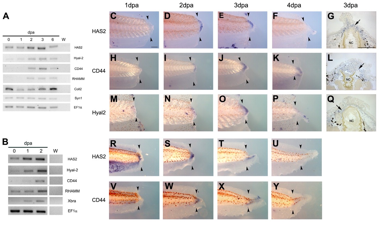 Fig. 1. Transient expression of components of the HA pathway during tail regeneration in Xenopus tadpoles. (A,B) Semi-quantitative RT-PCR analysis of the expression level of HA pathway components during tail regeneration of tadpoles amputated at stage (A) 48/50 and (B) 41/42. The levels of mRNA for HAS2, Hyal-2, CD44, RHAMM, collagen type II (Coll II) and syndecan1 (Syn1) were evaluated using specific primers. EF1α was used as loading control. (C-Y) In situ hybridization analyses of HA pathway components from tadpoles amputated at stage (C-Q) 48/50 and (R-Y) 41/42. Tails from 1 (C,H,M,R,V), 2 (D,I,N,S,W), 3 (E,J,O,T,X) and 4 (F,K,P,U,Y) dpa were processed for in situ hybridization with the indicated riboprobes. (G,L,Q) Sagittal sections of the most posterior part of regenerating tails at 3 dpa. Arrowheads, amputation plane; arrow, mesenchymal cells; NC, notochord. Scale bar: 200 μm. |