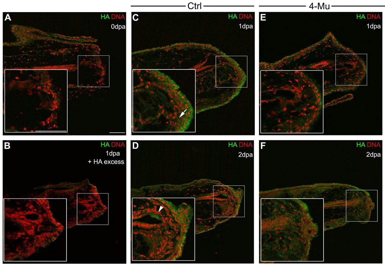 Fig. 2. HA levels increase during the first day of tail regeneration. (A-D) Tadpoles at stage 41/42 were amputated and fixed immediately (A), at 1 (B,C,E) or 2 (D,F) dpa. Sections were stained for bHABP (green) and nuclei (red) and analyzed by confocal microscopy. Insets show a higher magnification of the framed area. The arrow and arrowhead point to the presence of HA in the mesenchymal cells and the terminal ampulla, respectively. For experiment in panel B sections were also incubated with an excess of HA to demonstrate specificity of HA staining. (E,F) Effect of 4-Mu in HA levels. Tadpoles at stage 41/42 were amputated, incubated with 4-Mu 150 μM for 24 h and fixed at 1 (E) and 2 (F) dpa and stained for HA as above. Note the reduction in HA levels at 1 dpa. Scale bars: 50μ m. |
