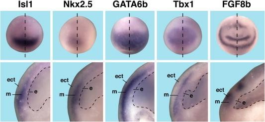 Fig. 1. Whole mount in situ hybridization of Xenopus laevis embryos at stage 13. The expression of Isl1, Nkx2.5, GATA6b, Tbx1, and FGF8b is given. Anterior views (upper row) of embryos are shown. Dashed lines indicate the level of sagittal sections shown in the lower row. e, endoderm; ect, ectoderm; m, mesoderm.