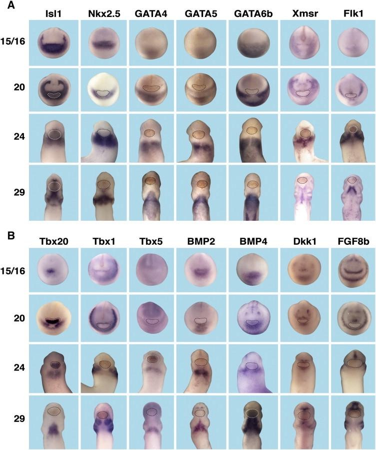 Fig. 2. (A) Cardiac expression of Isl1, Nkx2.5, GATA4, GATA5, GATA6b, Xmsr and Flk1 in Xenopus embryos at stages 15/16, 20, 24 and 29 as indicated. (B) Cardiac expression of Tbx20, Tbx1, Tbx5, BMP2, BMP4, Dkk1, and FGF8b at different developmental stages of Xenopus laevis as indicated. For embryos at stages 15/16 and 20 anterior views are presented, whereas embryos at stage 24 and 29 are shown from the ventral side, anterior is to the top. Dotted lines indicate the cement gland.