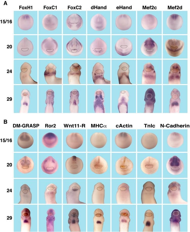 Fig. 3. (A) Cardiac expression pattern of FoxH1, FoxC1, FoxC2, dHand, eHand, Mef2c and Mef2d during Xenopus laevis. (B) Expression of the cardiac differentiation marker genes DM-GRASP, MHCα, cActin, TnIc, N-Cadherin as well as Wnt11-R and Ror2 during cardiac development. For stages 15/16 and 20 anterior views are shown, stages 24 and 29 are from the ventral side, anterior is to the top. Dotted lines indicate the cement gland.