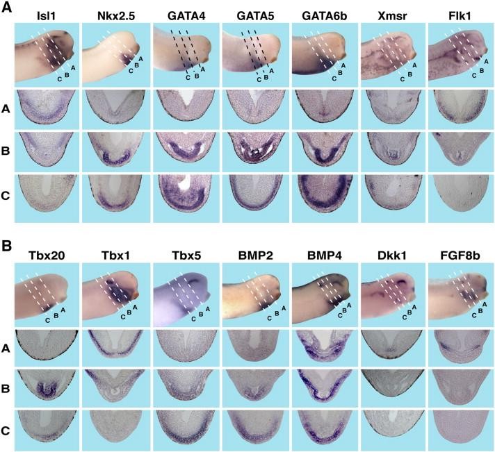 Fig. 6. (A) Serial transverse sections indicate the expression of Isl1, Nkx2.5, GATA4, GATA5, GATA6b, Xmsr and Flk1 in Xenopus laevis embryos at stage 30/31. (B) Spatial expression of Tbx20, Tbx1, Tbx5, BMP2, BMP4, Dkk1 and FGF8b at stage 30/31. The upper row provides a lateral view. Dashed lines depict the level of sections A, B and C as indicated. Level A corresponds to the anterior region of the heart. Level B is at the level of the closing heart tube. Level C is at the posterior end of the heart where the IFT forms later in development.