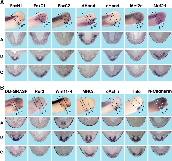 Fig. 7. (A) Expression of FoxH1, FoxC1, FoxC2, dHand, eHand, Mef2c and Mef2d at stage 30/31 in Xenopus laevis embryos. (B) Spatial expression pattern of DM-GRASP, Ror2, Wnt11-R, MHCα, cActin, cTnIc and N-Cadherin at stage 30/31. Embryos in the upper raw are shown from the lateral side. The dashed lines indicate the levels A (anterior part of the heart), B (closing linear heart tube) and C (IFT forming tissue) of transverse sections.