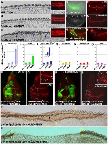 Figure 2. Mad GSK3 Mutants Mimic Wg Overexpression.(A–C) Additional bristles are induced in the wing margin by MGM driven by scalloped-Gal4. Arrows indicate chemosensory bristles and arrowheads stout mechanosensory bristles. Insets show that the number of Senseless-expressing bristle precursors in wing imaginal discs is increased by MGM, but not MWT.(D–G) Expression domains of sd-Gal4 driver, Wg protein, Armadillo stabilized by Wg (expression in the proveins is noted), and Senseless in wing discs. (H and I) Senseless protein expression was inhibited in Mad RNAi clones marked by GFP. (J–O) Quantitative RT-PCR of wing discs showing that MGM increased both a Wg target gene (senseless) and Dpp target genes (spalt and optomotor blind), while not affecting wg or hh levels. dpp was inhibited by MGM RNA. Samples were normalized for rp49, except for the inset in L in which Gal4 mRNA was used. (P and Q) Clonal overexpression of MGM does not change Wg levels. (R and S) MGM clone in the anterior margin causes ectopic expression of Senseless within the clone (inset). (T) Overexpression of MGM in clones marked by yellow induced duplications of the wing margin (n = 24). Yellow arrowheads indicate ectopic margins and a black arrowhead the wild type one. (U) Knockdown of Mad in clones partially eliminates the wing margin In this large clone the remaining margin bristles are yellow (y). |