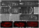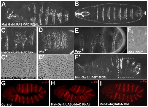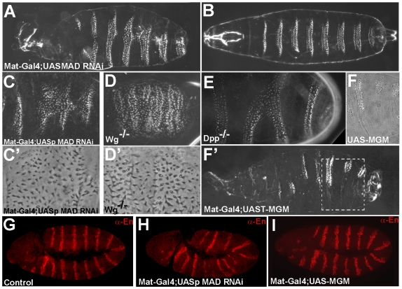 Figure 6. Mad Is Required for Segmentation in Drosophila.(A–B) Early depletion of Mad caused wider (ventralized) denticle belts and internalized posterior spiracles in embryonic cuticles (n = 259 cuticles, 20% ventralized and 34% ventralized with denticle belt fusions). (C and C') Denticle belt fusions showing large (row 5-like) denticles. (D and D') Wg loss-of-function caused a ventral lawn of denticles. Note that these are large denticles with a small refringent spot (row 5 denticles) resembling those seen in Mad RNAi depletion. (E) DppH46 mutant embryo showing fusion of two denticle belts. (F and F') Overexpression of UAST-MGM driven by mat-Gal4-VP16 caused patches of naked cuticle at the expense of denticle rows. (G–I) Embryos stained for Engrailed at stage 9, showing that Mad depletion disrupts abdominal segmental bands, while MGM overexpression does not. |