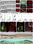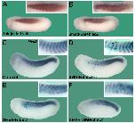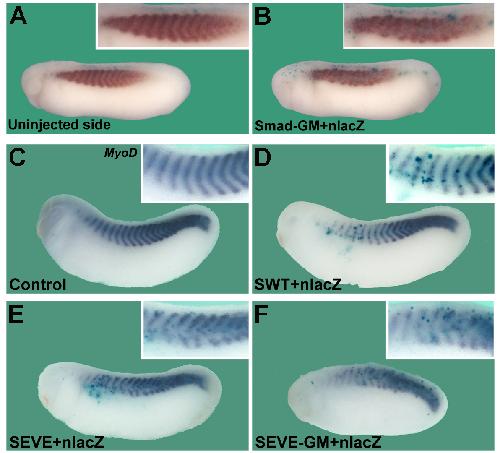 GSK3-resistant Activated Forms of Smad1 Disrupt Segmentation in Xenopus Embryos. (A and B) Immunostainings for myosin light chain showing loss of segmental borders in somites in the injected side (B) of a Xenopus embryo (stage 26), compared to the uninjected side. C2 or C3 blastomeres were injected with 100 pg of hSmad1 resistant to GSK3 phosphorylation [5] and 50 pg of nuclear LacZ mRNA (n = 32/42). (C) In situ hybridizations for the somite marker MyoD shows a disruption of the segmental pattern in Xenopus embryos (stage 30) injected with activated forms of Smad1. Uninjected control embryos express MyoD in the somitic segments in a typical chevron shape (n = 27). Overexpression of Smad1 wild-type mRNA (SWT) does not change this pattern (n = 21). An activated mutant of Smad1 that has phospho-mimetic amino acid substitutions on the C-terminus (the two most c-terminal serines mutated into glutamic acids, designated EVEmutant [5]) displays mild disruptions of the somite pattern (n = 9/12), while the same phospho-mimetic form of Smad1 with an additional mutation in the GSK3-phosphorylation site in the linker (named EVE-GM exhibits strongly impaired segmentation (n = 14/18). Nuclear LacZ marks the injected cells. |