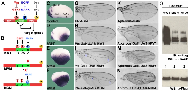 Figure 1. Phosphorylation-Resistant Mad Proteins are Hyperactive.(A) Model summarizing the integration of Dpp, EGFR and Wg signaling at the level of Mad phosphorylations in Drosophila. (B) Diagrams of Mad Wild Type (MWT), Mad MAPK Mutant (MMM) and Mad GSK3 Mutant (MGM) proteins. (C–F) Microinjection of MMM and MGM mRNAs into Xenopus embryos had stronger ventralizing activity than MWT, causing upregulation of sizzled (n = 17, 32, 26, and 30, two independent experiments). Brain markers otx2 and krox20 were repressed. (G–J) Driving MMM and MGM with patched-Gal4 in the anterior wing compartment caused formation of ectopic crossvein-like tissue. This tissue links longitudinal veins two and three in both proximal and distal regions, pulling the two veins closer together. (K–N) Driving phosphorylation-resistant Mads with apterous-Gal4 induced ectopic vein tissue and blistering, indicating increased Dpp signaling. (O) Polyubiquitinylation of Mad requires GSK3 and MAPK phosphorylation sites. Lane 1, 293T cells cotransfected with MWT-Flag, Drosophila Smurf and HA-ubiquitin all cloned in pCS2. The strong smear represents polyubiquitinylated Mad tagged with HA-ubiquitin. Lanes 2 and 3, polyubiquitinylation was greatly decreased in the MMM and MGM mutant proteins. The lower panel shows equal levels of immunoprecipitated Mad (α-Flag). |