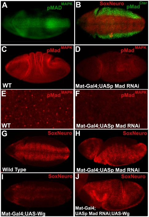 Figure 5. Mad Is Epistatic to Wg Signaling During Neurogenic Induction.(A) Mad was phosphorylated at its MAPK sites in developing CNS neuroblasts. (B) pMadCter was excluded from the neurogenic ectoderm marked by SoxNeuro (stage 8). (C and D) Mad RNAi driven in the egg by pUASp knocked down pMadMAPK staining (stage 7). (E and F) Maternal Mad RNAi knocked down pMADMAPK centrosomal staining (stage 7, see Figure S5 for asymmetric centrosomal staining). (G–J) Mad RNAi increased neurogenic ectodermal nuclei marked by SoxNeuro at stage 8, Wg overexpression reduced it, and the double Wg;RNAi embryos displayed the Mad depletion phenotype. All images were taken at identical exposure conditions. This experiment shows that Mad is epistatic to Wg. |