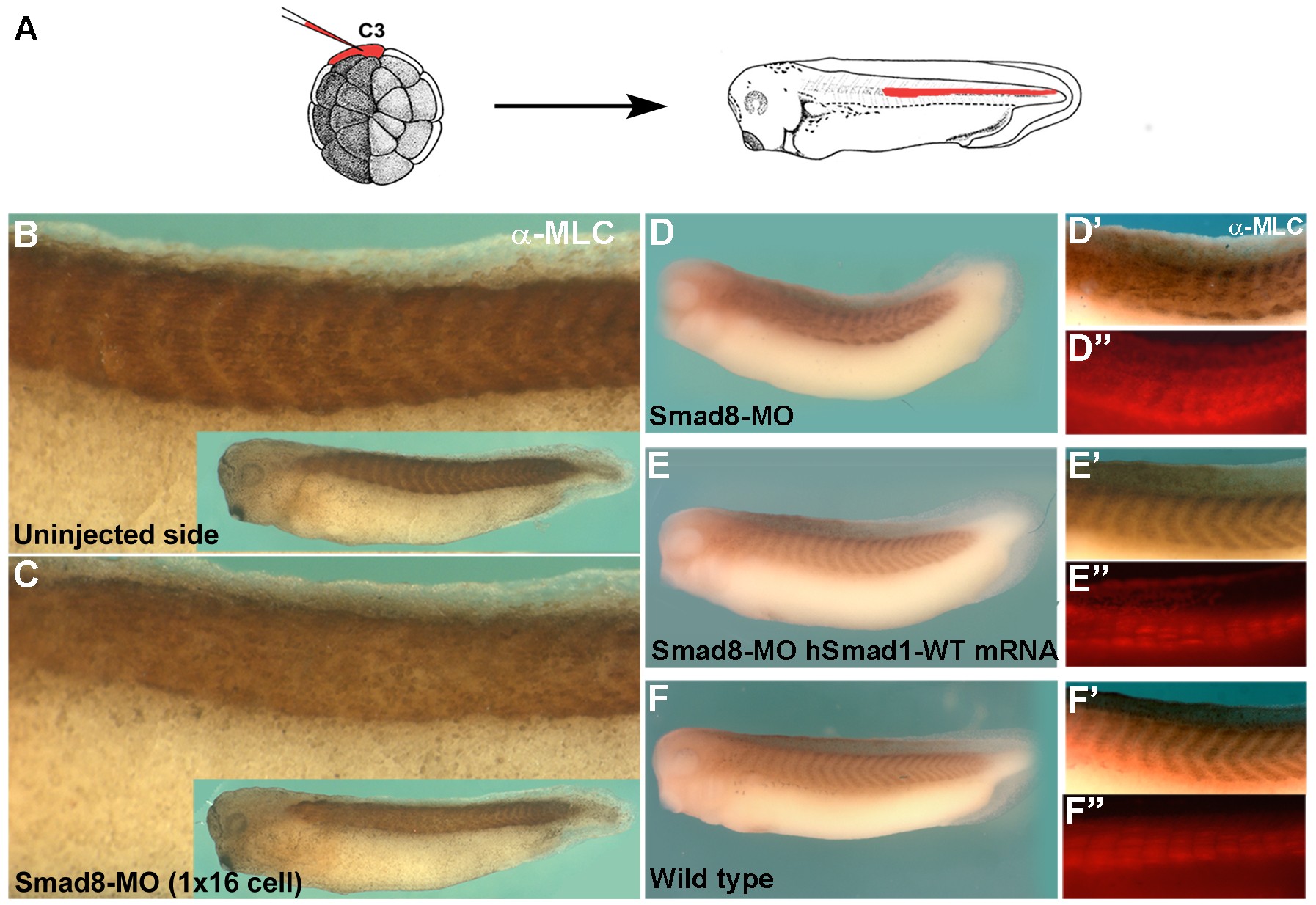 Figure 7. Smad5/8 Is Required for Segment Border Formation in Xenopus Embryos. (A) Illustration of C3 Xenopus blastomere injection at the 32 cell stage. The fate of C3 cells in the somites is indicated in a stage 28 tadpole. (B and C) In Xenopus, microinjection of Smad8-MO at the 16 or 32 cell stage (in C2 or C3 blastomeres) erased segmental somite borders on the injected side. Somites are composed mostly of segmental muscles, which were stained for myosin light chain (a-MLC). (D-F0) Smad8-MO effects on segment borders were cell autonomous (co-injection at 32-cell stage with rhodamine dextran amine lineage tracer), and were rescued by human Smad1 mRNA (n = 55, 44 with somite fusions, n = 19, with 17 completely rescued, n = 24, all normal, respectively, 3 independent experiments). |