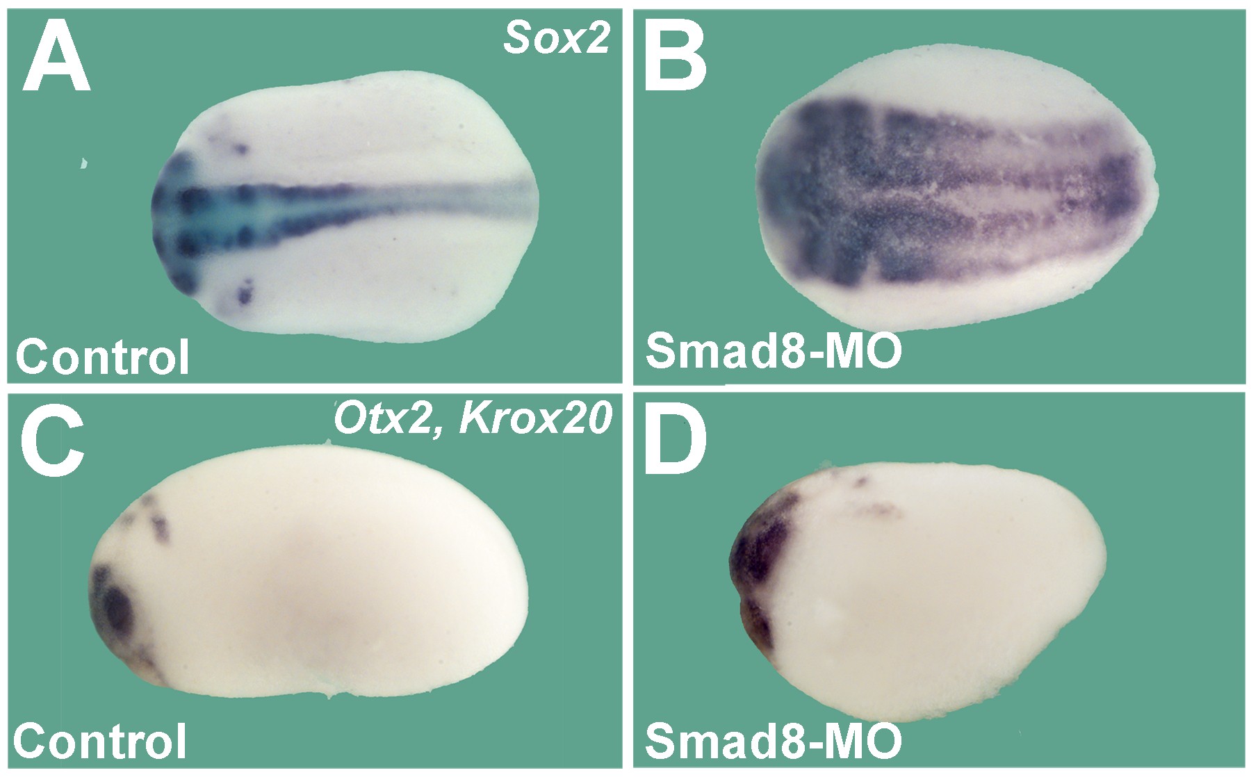 Knockdown of xSmad8 Dorsalizes Xenopus Embryos. (A) Whole-mount in situ hybridization for the pan-neural marker Sox2 in an uninjected control embryo, stage 22, dorsal view. (B) Injection of xSmad8 morpholino (0.5 mM, 4 nl injected four times radially) leads to expansion of the neural plate. (C) Control embryo stained for Otx2 (forebrain and midbrain marker) and Krox20 (hindbrain, rhombomeres 3 and 5), lateral view. (D) Smad8-depleted embryos are dorsalized (anti-BMP phenotype) and show expansion of head structures. It should be mentioned here that the original depletion of Xenopus laevis Smad8 by Miyanaga et al [30] yielded a very different result, namely apoptosis via activation of caspases. However, it should be noted that their methods for depletion were different. They used DNA oligonucleotides to deplete Smad8 transcripts in oocytes that were then subjected to maternal transfer and fertilization. We used morpholino oligos (of a different sequence) injected at the 4-cell stage, and therefore the depletion of maternal transcripts must have been less extensive. This explains why we did not observe apoptosis, but instead dorsalization (anti-BMP phenotype) of the embryo. The morpholino described here provides a useful reagent for knockdown of the maternal Xenopus laevis BMP-Smad. Smad8 probably corresponds to the homolog of zebrafish Smad5 [10] and is therefore referred to below as Smad5/8. |
