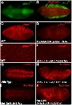 Figure 3. Phospho-Specific Antibodies Reveal Wg-regulated Segmental Expression Patterns of pMadMAPK and pMadGSK3.(A and B) Western blot analysis of pMadMAPK and pMadGSK3 antibodies demonstrating that they were phospho-specific, and that GSK3 phosphorylation had an absolute requirement for MAPK priming. Drosophila S2 cells were transiently transfected with the plasmids indicated. (C) Cultured 293T cells stably transfected with Mad-Flag treated with L-cell control conditioned medium (CMed), Wnt3a medium, control DMEM (Con), or 30 mM LiCl in DMEM for 2 hours. Wnt3a and LiCl inhibited the MadGSK3 phosphorylation band and increased β-Catenin levels (indicating that the Wnt treatment was effective). (D and E) pMadMAPK and pMadGSK3 antibodies stain the entire blastoderm and a Dpp-dependent dorsal stripe (inset). (F) pMadMAPK tracks ventral EGFR-activated MAPK (inset shows diphospho-Erk staining). (G and H) Segmental staining of pMadMAPK (Stage 9) and pMadGSK3 (Stage 17). (I) In Wg null mutants segmental expression is lost. Mutant embryos were identified by lack of staining with Wg antibody. Inset shows same embryo stained with DAPI to indicate that, despite its abnormal shape, it reached late stages of development. (JâL) Wg stabilizes pMadMAPK, overlapping with Wg stripes. (MâO) Nuclear pMadGSK3 accumulates in between Wg stripes, indicating that Wg inhibits Mad phosphorylation at GSK3 sites in vivo. (PâR) Wg overexpression driven with prd-Gal4 stabilizes pMadMAPK over a broader domain compared to just MWT alone (compare brackets in P and R). This experiment shows that Wg expression stabilizes pMADMAPK. |