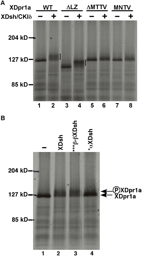 Figure 3. Mutations of XDpr1a or XDsh that block their mutual interaction also block CKIδ-mediated XDpr1 phosphorylation.A. Deletion or mutation of XDpr1a's PDZ-B domain blocks CKIδ-mediated XDpr1a phosphorylation. Deletion of the leucine zipper domain of XDpr1a (ΔLZ), which does not affect its ability to bind XDsh, does not affect the ability of XDpr1a to be phosphorylated by CKIδ, as exhibited by a mobility shift. XDpr1a containing a deletion (ΔMTTV) or a point mutation (MNTV) of its PDZ-B domain is not phosphorylated by CKIδ. The braces in lanes 2 and 4 bracket phosphorylated XDpr1a and ΔLZ, respectively. B. An Asn317Thr Mutation in XDsh's PDZ domain abrogates its promotion of XDpr1a phosphorylation. ***β-βXDsh, which contains Gln272Ala, Ser273Ala, and Glu275Ala mutations in a PDZ domain loop outside of the PDZ-B binding domain, promotes XDpr1a phosphorylation by CKIδ at a level similar to that of wild-type XDsh, while *αXDsh, which contains an Asn317Thr mutation in the PDZ-B binding domain within its PDZ domain, does not.