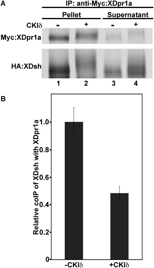 Figure 4. Phosphorylation of XDpr1a and XDsh by CKIδ reduces their interaction.A. Myc-tagged XDpr1a was immunoprecipitated in the presence of HA-tagged XDsh in the absence or presence of CKIδ. The presence of CKIδ reduced the coimmunoprecipitation of XDsh with XDpr1a. B. Quantitation of the relative coimmunoprecipitation (coIP) of XDsh with XDpr. The quantitation of the coimmunoprecipitation of XDsh with XDpr1a revealed that the presence of CKIδ reduced the interaction between XDpr1a and XDsh by approximately one-half when compared to the control. Error bars signify standard deviation.