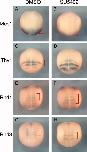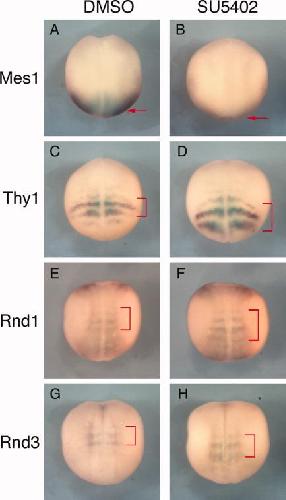 Figure 4. Posteriorly shift of Rnd1 and Rnd3 expression domains by fibroblast growth factor (FGF) inhibitor SU5402. A-H: Stage 14 embryos were incubated with (B,D,F,H) or without (A,C,E,G) 50 mu M SU5402 for 3.5 hr, and stained in whole-mount for the expression of Mes1 (A,B), Thy1 (C,D), Rnd1 (E,F), and Rnd3 (G,H). Red arrows or brackets show expression of genes indicated. All embryos are oriented with anterior to the top, and dorsal views are shown. |