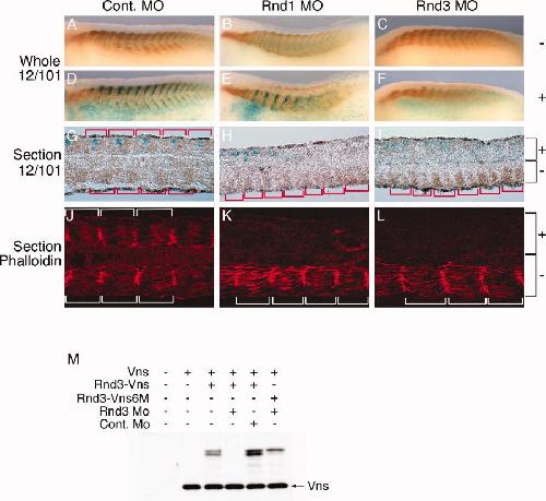 Figure 5. Gene depletion of Rnd1 and Rnd3 disrupted somite formation. A-L: Antisense morpholino oligonucleotide (MO) for control (A,D,G,J), Rnd1 (B,E,H,K), or Rnd3 (C,F,I,L) was injected on one side of the four-cell stage embryos with nlacZ mRNA. At tail bud stage, all embryos were stained in blue with X-gal. A-F: Embryos were stained in whole-mount with monoclonal 12/101 antibody. A-F: Lateral views of noninjected side (A-C) and MO plus nlacZ injected side (D-F) are shown. G-I: Embryos were stained in longitudinal tissue section with monoclonal 12/101 antibody. Red brackets show each somitic unit. J-L: Embryos were stained in longitudinal tissue section with phalloidin. White brackets show each somitic unit. All images are positioned with anterior to the left. G-L: MO plus nlacZ injected side to the top and noninjected side to the bottom (indicated by + and -, respectively), and dorsal views are shown. M: The effect of Rnd3 MO on Rnd3 mRNA transcription was tested with in vitro transcription/translation system. Rnd3 MO inhibited the Rnd3-Vns transcription constructed to generate a fusion protein with eYFP (Vns) specifically, but not inhibited a rescue construct Rnd3-Vns6M. Vns was used as loading control. |