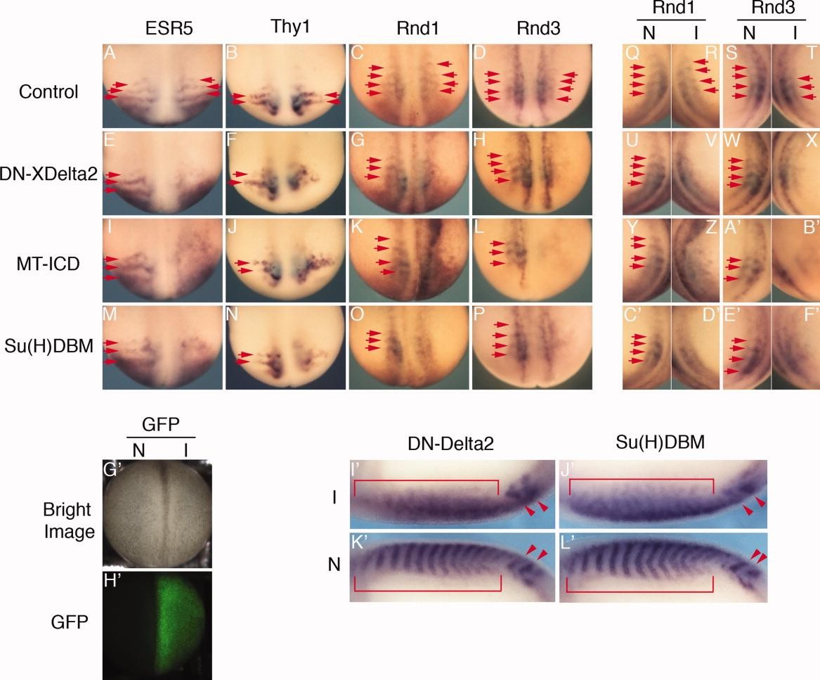 Figure 3. Disruption of Rnd1 and Rnd3 expression patterns by overexpression of dominant-negative or active form of Notch signal genes. A-L prime : Water (A-D,Q-T), mRNA of (E-H,U-X,I prime ,K prime ) DN-XDelta2, (I-L,Y-B prime ) MT-ICD, or (M-P,C prime -F prime ,J prime ,L prime ) Su(H)DBM was injected on one side of the four-cell stage embryos with green fluorescent protein (GFP) mRNA for tracer. At the neurula stage (A-F prime ) or tail bud stage (I prime -L prime ), GFP signal was observed in the injected embryos as a lineage trace (G prime ,H prime ), and stained in whole-mount for the expression of ESR5 (A,E,I,M), Thy1 (B,F,J,N), Rnd1 (C,G,K,O,Q,R,U,V,Y,Z,C prime ,D prime ), and Rnd3 (D,H,L,P,S,T,W,X,A prime ,B prime ,E prime ,F prime ,I prime -L prime ). Red arrows show gene expression domains (A-E prime ), and red brackets or arrowheads show Rnd3 expression domains in somite or presomitic mesoderm (PSM), respectively (I prime -L prime ). A-P: Embryos are oriented with anterior to the top, and dorsal views are shown. Left: Noninjected; right: injected side of mRNAs. Q-F prime : Embryos are oriented with anterior to the top, dorsal to the right (Q,S,U,W,Y,A prime ,C prime ,E prime ) or left (R,T,V,X,Z,B prime ,D prime F prime ), and lateral views are shown. I prime -L prime : Embryos are oriented with anterior to the left, dorsal to the top (K prime ,L prime ) or bottom (I prime ,J prime ), and lateral views are shown. N: noninjected; I: injected side of mRNAs. |
