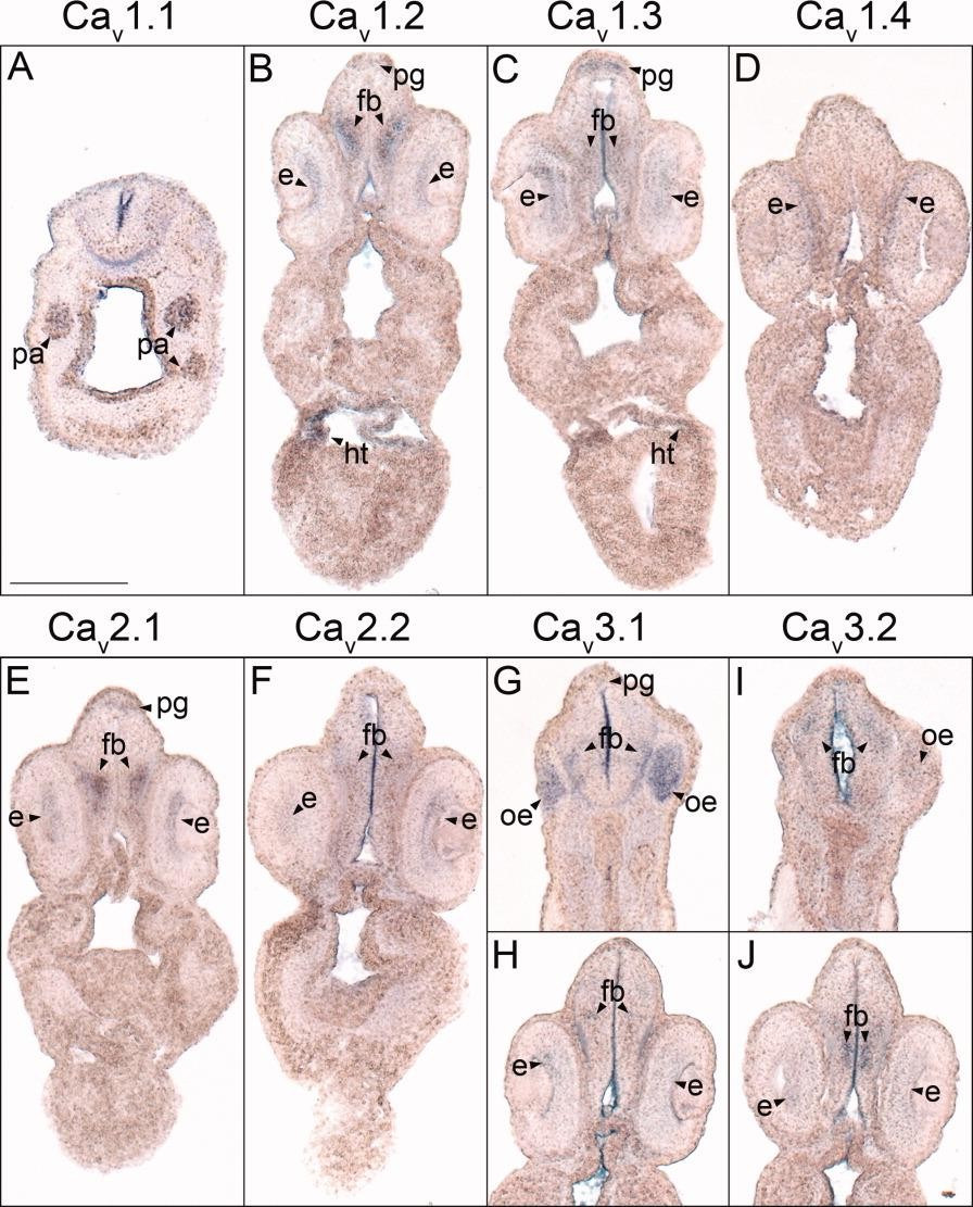 Figure 3. Forebrain histological analysis of voltage-gated calcium channel (VGCC) alpha 1 subunit expression in stages 35-37 (swimming tadpole) Xenopus laevis using whole-mount in situ hybridization. A-J: Transverse 18- mu m sections within the forebrain region of the anterior-posterior axis, with dorsal to the top. A: CaV1.1 expression. B: CaV1.2 expression. C: CaV1.3 expression. D: CaV1.4 expression. E: CaV2.1 expression. F: CaV2.2 expression. G,H: CaV3.1 expression. I,J: CaV3.2 expression. Arrowheads indicate regions of expression. fb, forebrain; e, eye; ht, heart; oe, olfactory epithelium; pa, pharyngeal arches; pg, pineal gland. Scale bar = 0.25 mm. |
