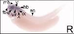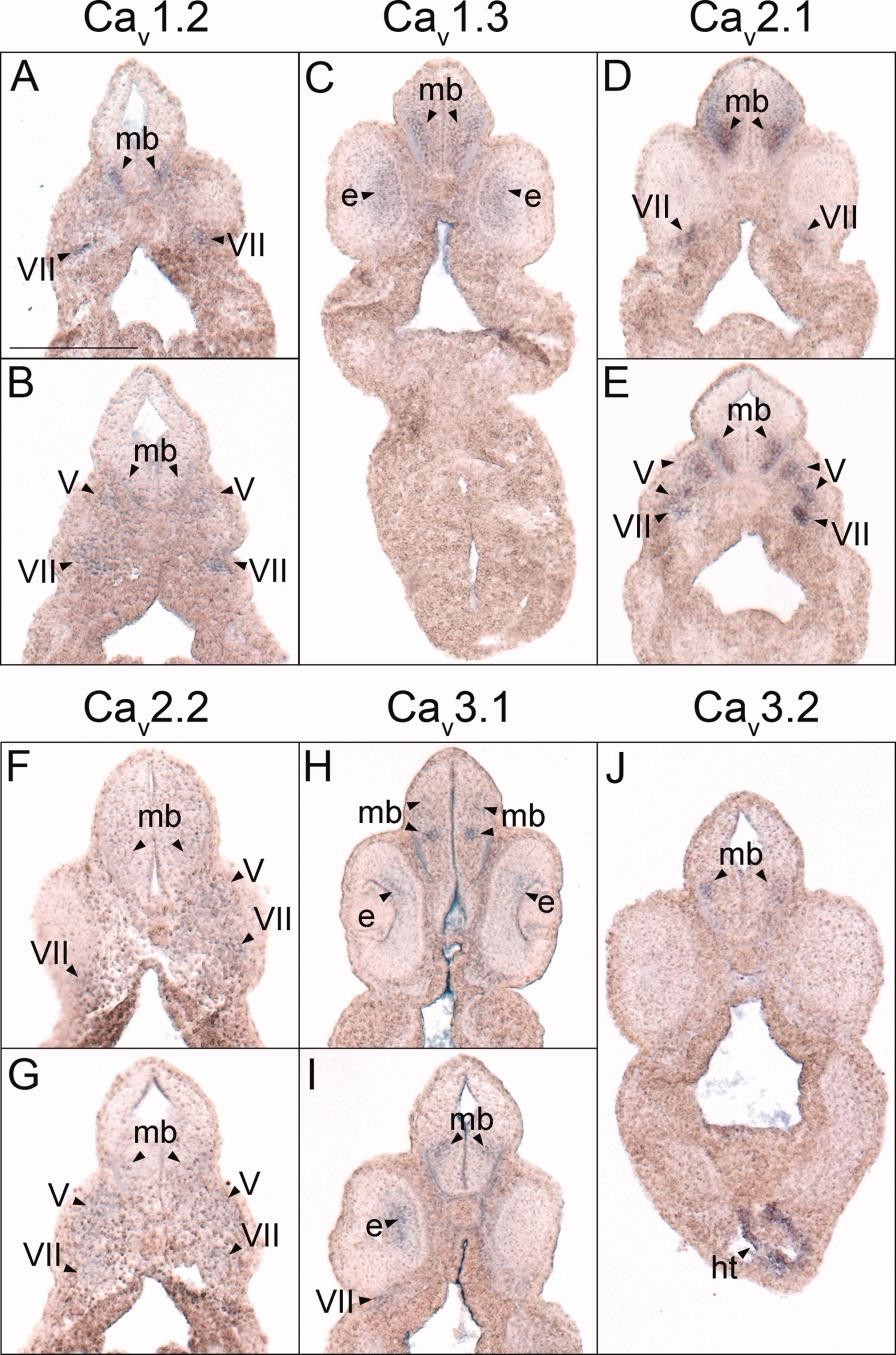 Figure 4. Midbrain histological analysis of voltage-gated calcium channel (VGCC) alpha 1 subunit expression in stages 35-37 (swimming tadpole) X. laevis using whole-mount in situ hybridization. A-J: Transverse 18- mu m sections within the midbrain region of the anterior-posterior axis, with dorsal to the top. A,B: CaV1.2 expression. C: CaV1.3 expression. D,E: CaV2.1 expression. F,G: CaV2.2 expression. H,I: CaV3.1 expression. J: CaV3.2 expression. Arrowheads indicate regions of expression. mb, midbrain; e, eye; ht, heart; V, cranial ganglion V, trigeminal ganglion; VII, cranial ganglion VII, geniculate (facialis) ganglion. Scale bar = 0.25 mm. |