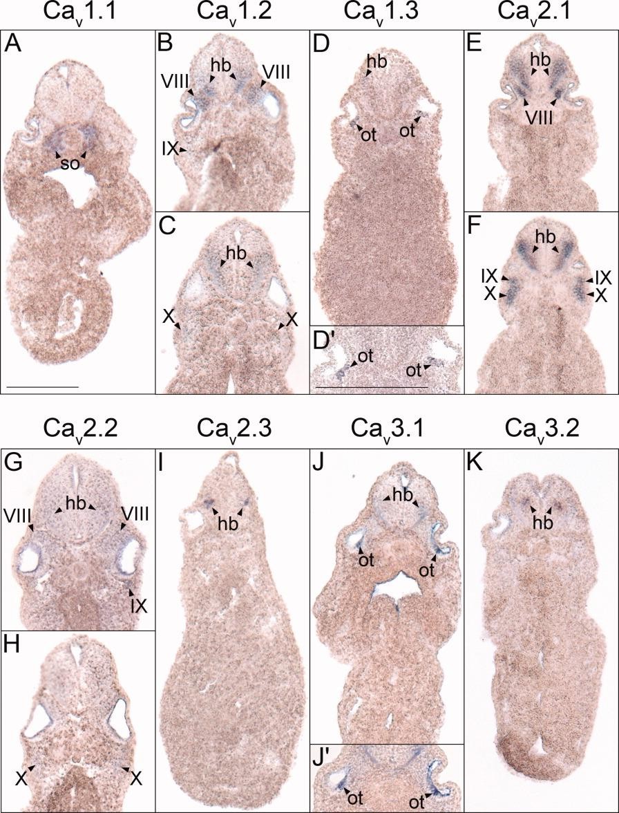 Figure 5. Hindbrain histological analysis of voltage-gated calcium channel (VGCC) alpha 1 subunit expression in (A-G,J,K) stage 35-37 (swimming tadpole) or (I) stage 30 (late tail bud) X. laevis using whole-mount in situ hybridization. A-K: Transverse 18- mu m sections of embryos within the hindbrain region of the anterior-posterior axis, with dorsal to the top. A: CaV1.1 expression. B,C: CaV1.2 expression. D: CaV1.3 expression. E,F: CaV2.1 expression. G,H: CaV2.2 expression. I: CaV2.3 expression. J: CaV3.1 expression. K: CaV3.2 expression. Arrowheads indicate regions of expression. hb, hindbrain; ot, otic vesicle; so, somite; VIII, cranial ganglion VIII, acousticus ganglion; IX, cranial ganglion IX, glossopharyngeal ganglion; X, cranial ganglion X, vagal ganglion. Scale bar represents 0.25 mm. |