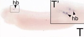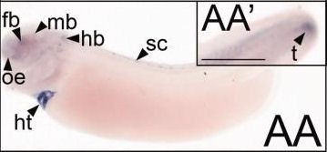 Figure 2. Spatial and temporal expression patterns of VGCC alpha 1 subunits in developing X. laevis embryos using whole-mount in situ hybridization. Embryos were viewed laterally, with anterior to the left and dorsal to the top. A,D,G,J,M,P,S,V,Y: Stages 24-26 (early tail bud). B,E,H,K,N,Q,T,W,Z: Stages 29-31 (late tail bud). C,F,I,L,O,R,U,X,AA: Stages 34-36 (swimming tadpole). A-C: CaV1.1 expression. D-F: CaV1.2 expression. G-I: CaV1.3 expression. J-L: CaV1.4 expression. M-O: CaV2.1 expression. P-R: CaV2.2 expression. S-U: CaV2.3 expression. V-X: CaV3.1 expression. Y-AA: CaV3.2 expression. D prime ,F prime ,S prime ,T prime ,W prime ,Y prime : Magnified images of portions of the embryos indicated by the hollow boxes. AA prime : Magnified image of the tail of an embryo at swimming tadpole stage showing CaV3.2 expression. Arrowheads indicate regions of expression. fb, forebrain; e, eye; hb, hindbrain; ht, heart; mb, midbrain; oe, olfactory epithelium; ot, otic vesicle; pa, pharyngeal arches; pg, pineal gland; sc, spinal cord; so, somite; t, tail bud; V, cranial ganglion V, trigeminal ganglion; VII, cranial ganglion VII, geniculate (facialis) ganglion; IX, cranial ganglion IX, glossopharyngeal ganglion; X, cranial ganglion X, vagal ganglion. Scale bars = 1.0 mm in A-AA, 0.4 mm in AA prime ; 0.2 mm in D prime ,F prime ,S prime ,T prime ,W prime ,Y prime . |