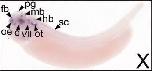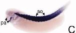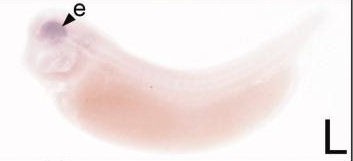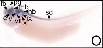 cacna1a ( calcium channel, voltage-dependent, P/Q type, alpha 1A subunit ) gene expression in Xenopus laevis embryo, assayed via in situ hybridization, NF stage 28, lateral view, anterior left, dorsal up. |
