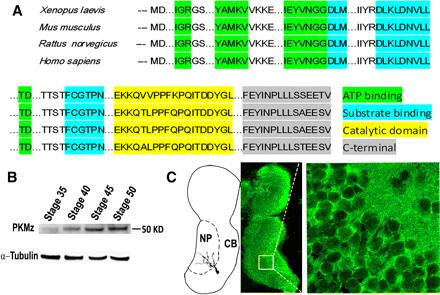 Figure 1. Characterization of Xenopus PKMz. A, Alignment of predicted PKMz amino acid sequences from Xenopus laevis and other species. Regions corresponding to postulated major motifs are highlighted. B, Western blot using an antibody raised against the catalytic domain of rat PKMz identifies a 50 kDa protein from Xenopus brain extracts, demonstrates a progressive developmental increase in expression. C, Schematic drawing of tadpolebrain (left) and horizontal section stained with PKMz antibody demonstrating enriched immunoreactivity in the neuropil region (NP) and the membrane portion of cell body (CB) region of the tectum.