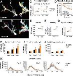 Figure 2. PKMz overexpression stabilizes dendritic filopodia and restricts arbor extension. A, B, Superimposed images of six successive time points (each a different color, with overlap = white) at 10 min imaging intervals of a neuron expressing exogenous PKMz (A) and a control neuron (B). Area within the boxed region is enlarged on the right. Scale bars, 20 μm. CâG, Morphometric analysis of dendritic filopodial dynamics of PKMz neurons (N = 6 cells; n = 269 filopodia) and control neurons (N = 7 cells; n = 255 filopodia). PKMz overexpression significantly decreases the rates of filopodial addition and elimination (C); increases the fraction of filopodia that persist for 1 h (D) and mean filopodial lifetime (E); decreases filopodial motility (F) and dynamic range (G). HâK, 3D morphometric analysis of tectal neurons expressing GFP alone (control, n = 12) and GFP with PKMz (n = 10) 1â4 d after electroporation. PKMz overexpression restricts daily addition of dendritic arbor size (H), attributable to decreased extension of branches (I) but not filopodia (J). K, 3D Sholl analysis of dendritic arbor complexity 1â4 d after transfection. *p < 0.05; **p < 0.01.
